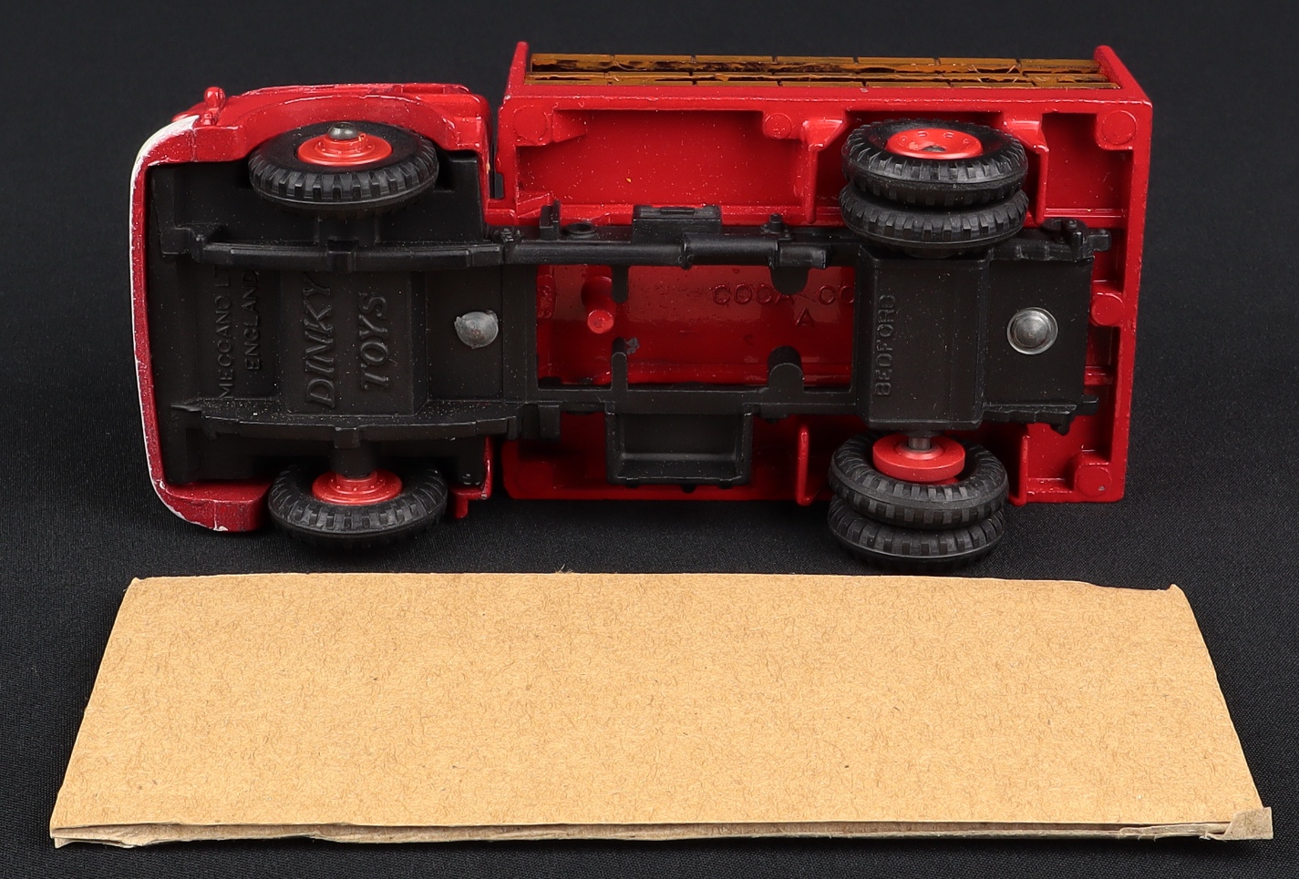 The colourful pictorial end flap box is clean and bright. A couple of end flap scuffs and a little handling/age wear. Small area of surface loss on an non-picture side due to the (most likely) removal of an old price label at some time. Attractive decorative period scene proves a fine backdrop to this Bedford Truck.