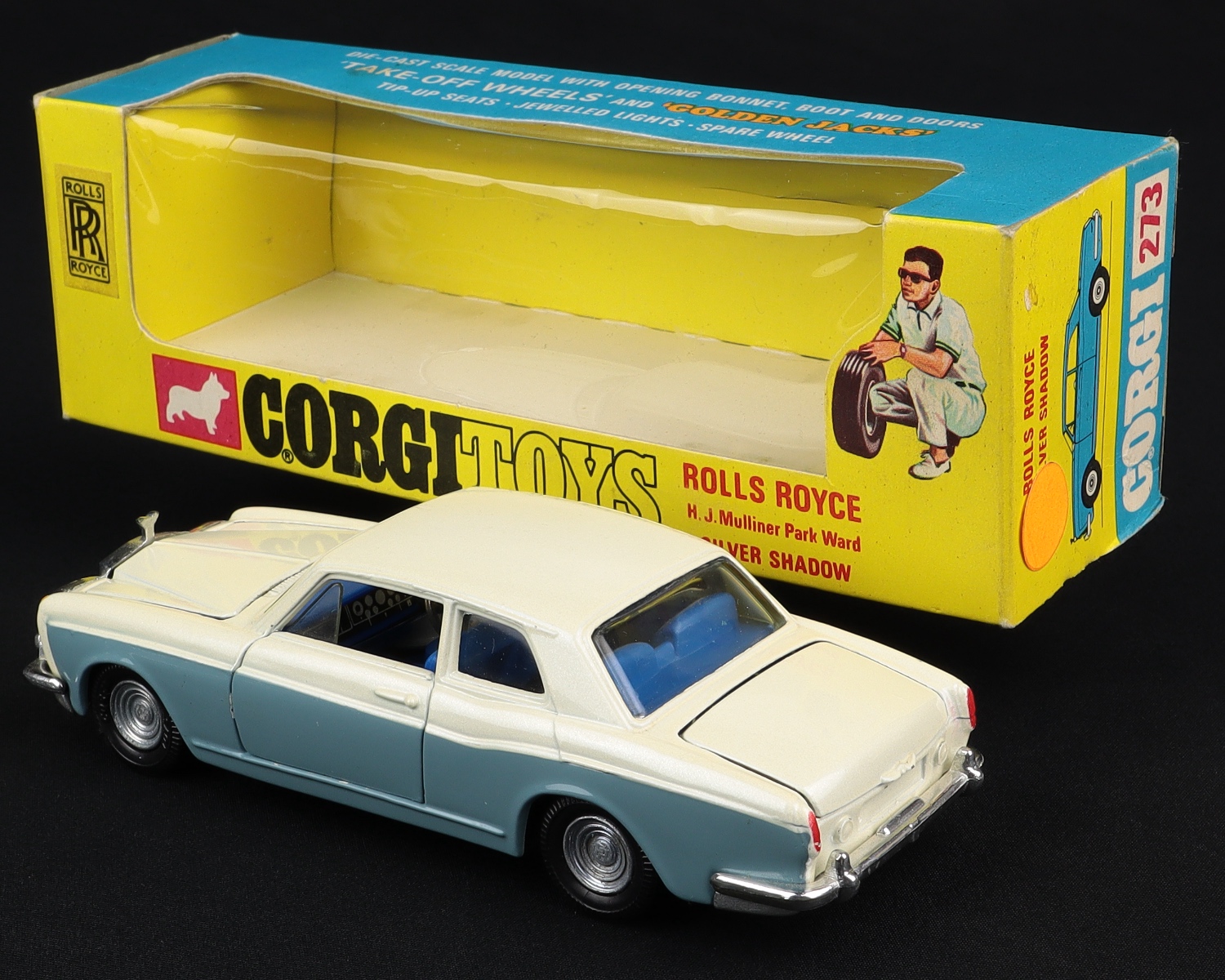 This prestigious model from Corgi was issued during 1970. It has a distinctive pearlescent white and Wedgwood (grey-blue) paint finish. Vivid blue detailed interior, gold steering wheel, opening bonnet, boot and doors, and silver-coloured ‘Golden Jacks’ Take Off Wheels. Intact bonnet emblem. Silver-grey base. Gleaming jewelled headlights.