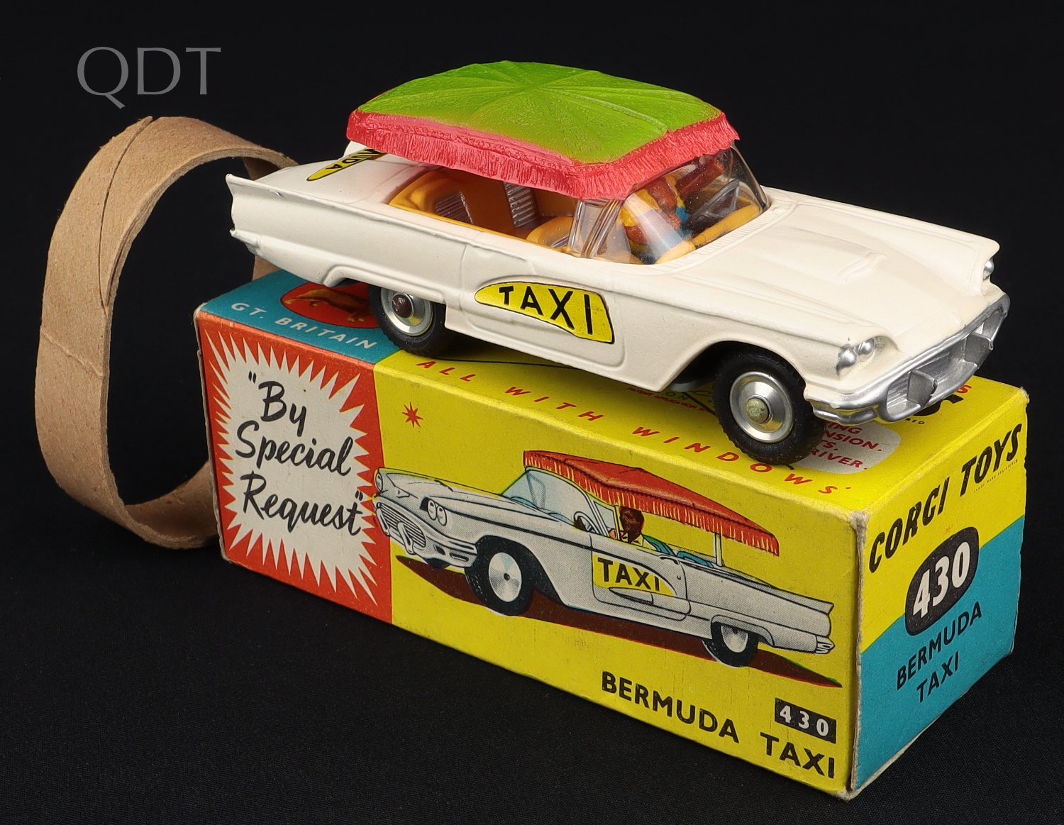 Ford Thunderbird Bermuda Taxi by Corgi Toys, No. 430. Lime green & red canopy. Very near mint/boxed, with card packing. From The Elmer Collection.