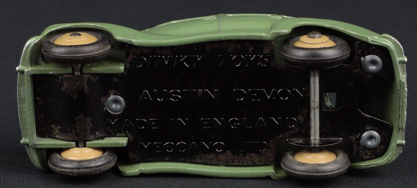 Issued various colour finishes, this particular version is not an easy find! In original condition throughout, with a shining suede green finish with fawn wheels. Large print baseplate and ‘DEVON’ cast into the underside of the roof. Fine as-new original tyres.