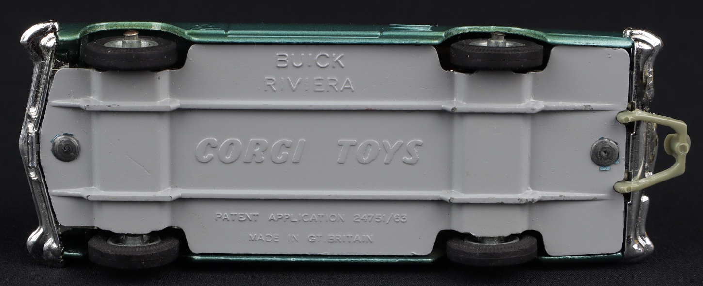 Buick Riviera by Corgi Toys, No. 245. Scarce metallic GREEN-BLUE issue with SPOKED WHEELS. Very near mint/boxed. From The Berlin Collection.