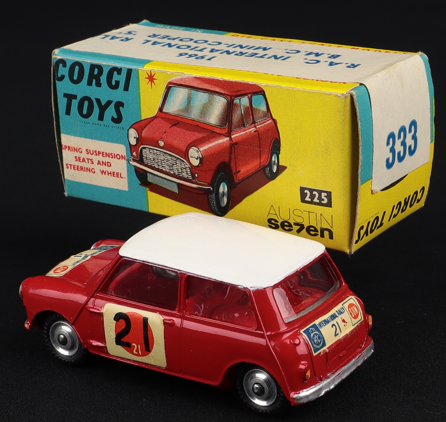 1966 Mini Cooper 'S' "SUN-RAC Rally" by Corgi Toys, No. 333. Shaped spun wheel issue. Very near mint/boxed. From The Elmer Collection.