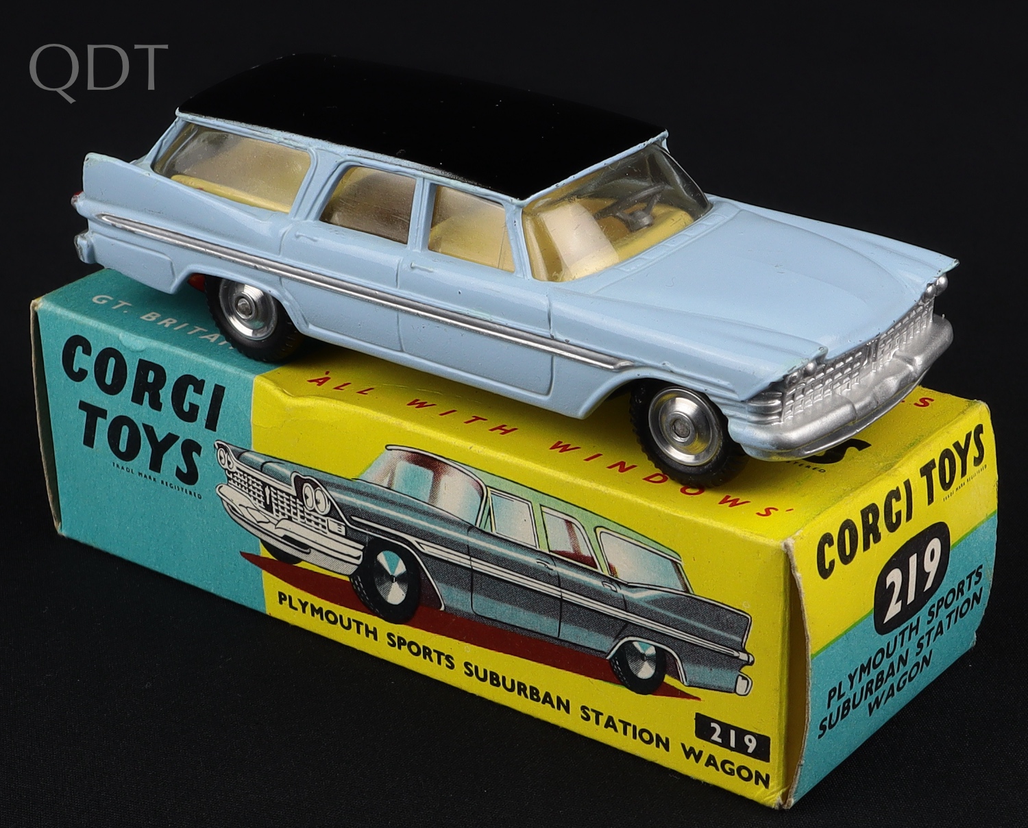 Plymouth Suburban Sports by Corgi Toys, No. 219. COLOUR TRIAL IN PALE BLUE & BLACK. Near mint/boxed. From The Gower Collection. QDT starting bid £500. Please note that QDT apply 12.5% buyer's commission