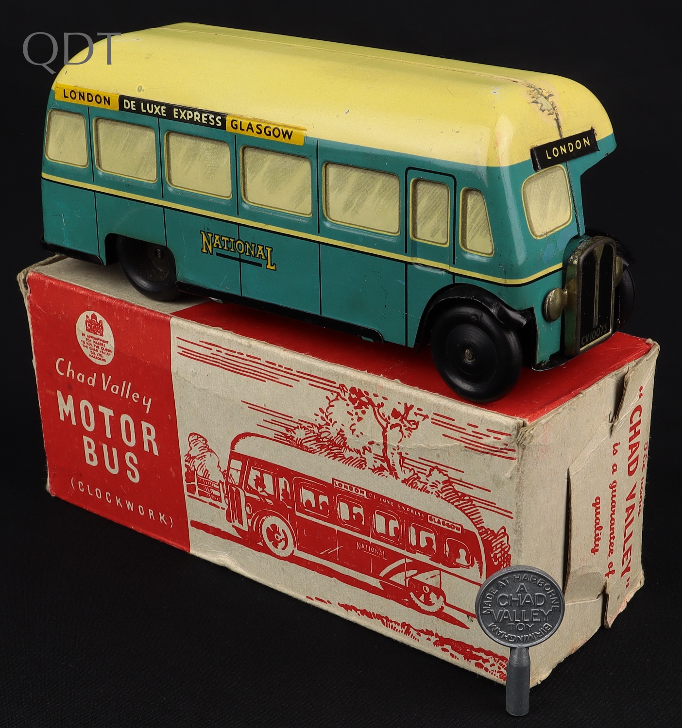 Single Decker Motor Bus by Chad Valley, No. 10073. Near mint/boxed. Scarce find in blue & cream. With working clockwork motor & key. From The Denis Tyler Collection. Starting bid £75. Please note that QDT apply 12.5% buyer's commission.