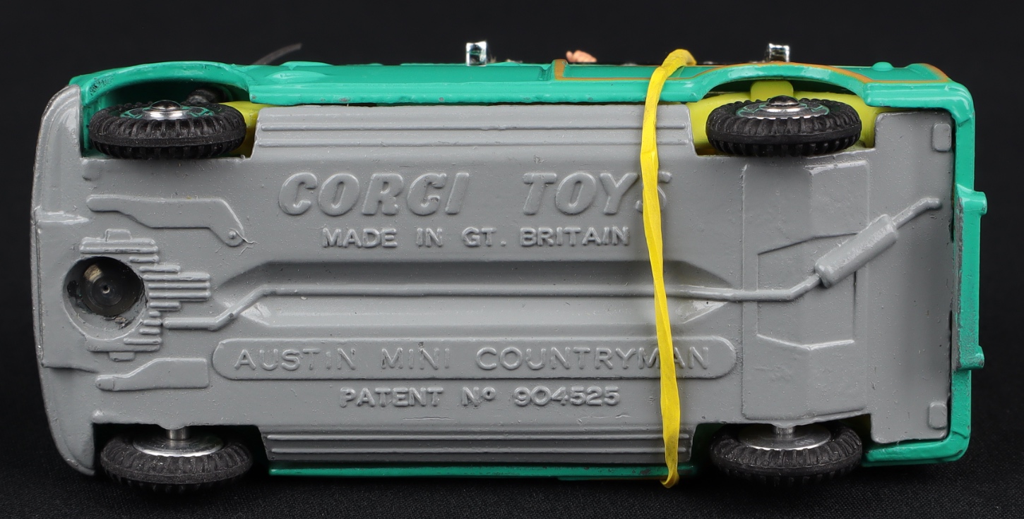 Issued between 1965-69, this popular ‘Surfing’ Mini model has a sea-green finish, ‘wood panelling’, vivid yellow interior, jewelled headlights, straight aerial, bright chrome roof-rack with two surf boards, and surfing figure.