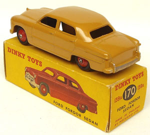 Dinky 170 Ford Sedan. Tan version with red wheels. Very near mint/scarce dual-numbered box. From a specialist Dinky collector in Surrey.