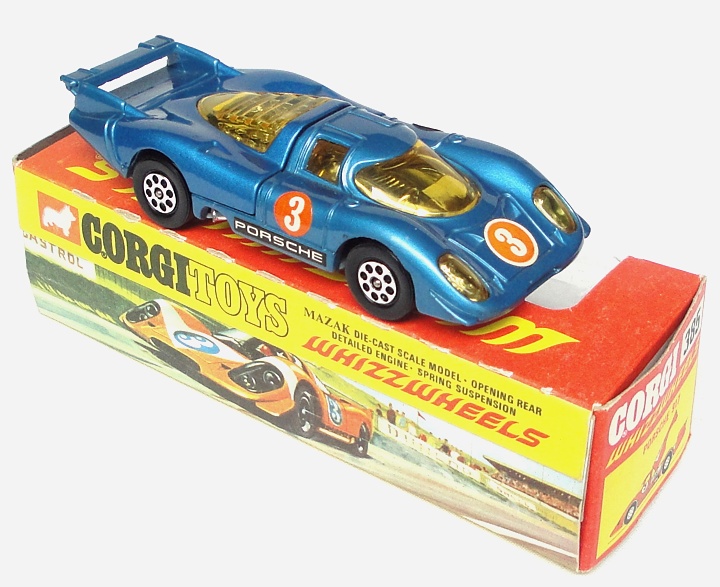 This Porsche model has a bright metallic blue finish with complete labels (tiny wear), amber glass, detailed silver engine and Whizzwheels.