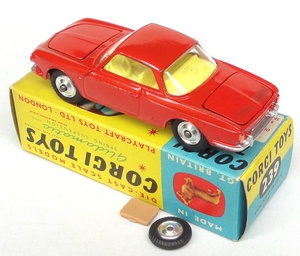 Corgi 239 Volkswagen 1500 Karmann Ghia. Red issue. Very near mint/boxed. With luggage and spare wheel.