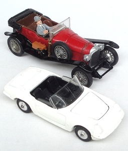 2) Emma Peel’s Lotus Elan S2 is in sparkling white finish. Very near mint condition with just one little mark at a front bumper. Suspension on shaped spun wheels. Original figure of Emma Peel.