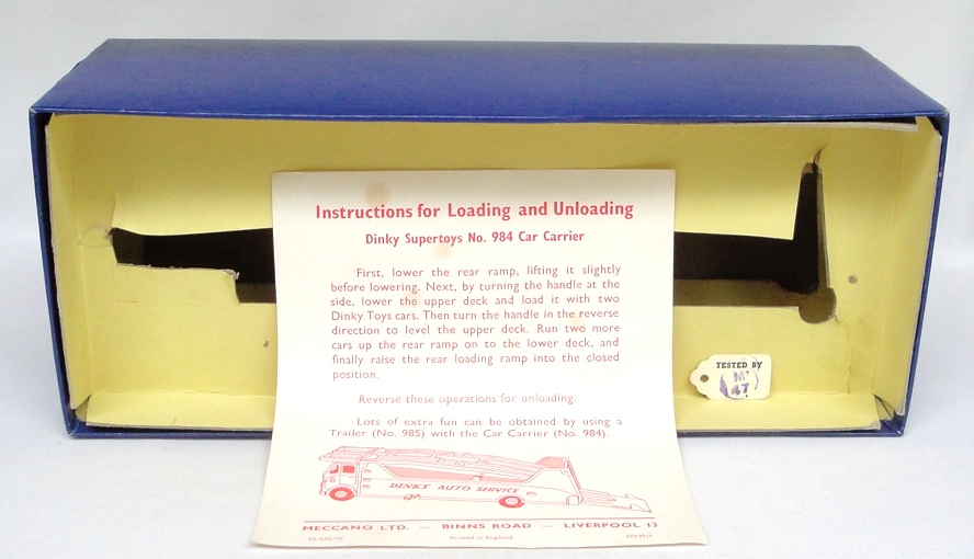 Dinky 984 "DINKY AUTO SERVICE" Car Carrier. Very near mint/boxed. With two packing pieces, leaflet Dinky Quality Control Tag. From The European Collection.