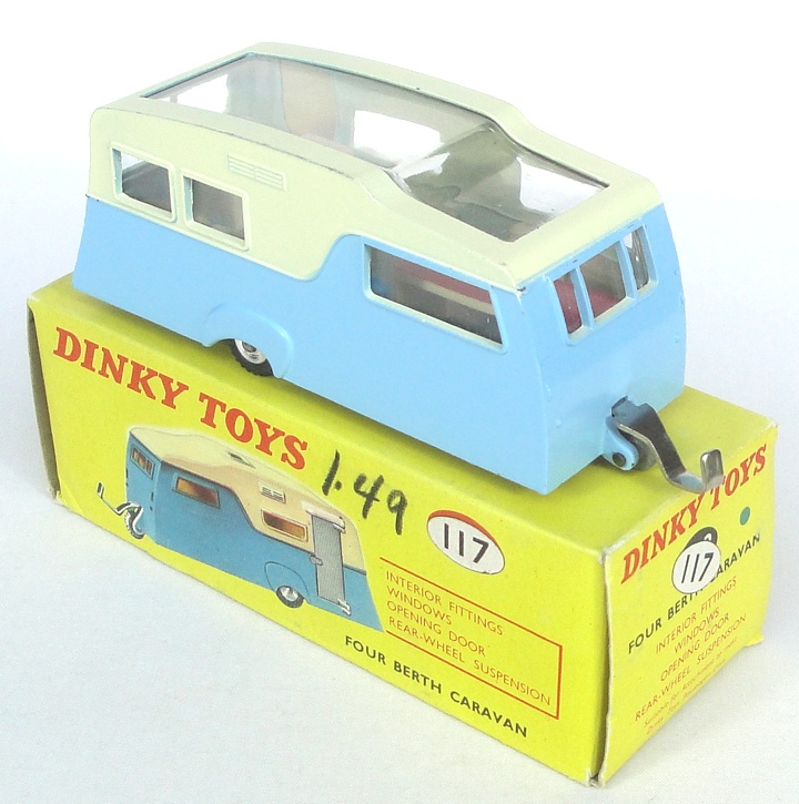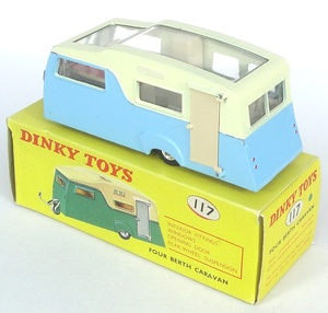 Dinky 117 Four Berth Caravan. Blue & cream issue with gloss base. Near mint/late 188 box with overstuck 117 Dinky stamp. Unusual issue from The Reference Collection.