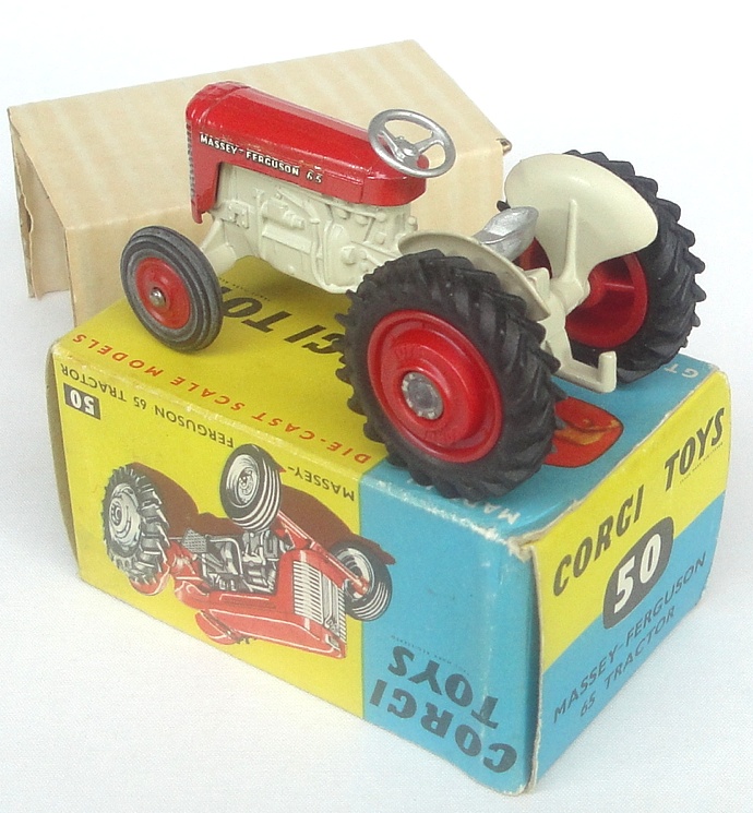 Corgi 50 Massey-Ferguson 65 Tractor. BRIGHT RED AND FAWN VERSION with WHITE LETTERING. Very, very near mint/boxed, with packing sleeve.