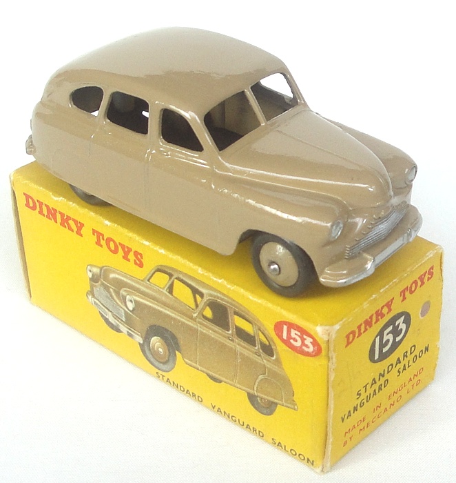 Dinky 153 Standard Vanguard Saloon. Pale brown. Near mint/boxed. Scarce LATE ISSUE WITHOUT VANGUARD CAST ON ROOF. Issued March 1957. From The Harrogate Collection.