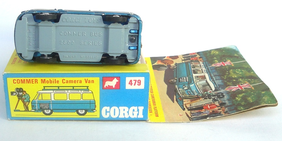 This blue and white Commer Van has a bright mid-blue interior, and suspension on spun wheels. AS-new Corgi tyres with ‘Corgi Toys’ embossed. Complete with intact ‘Samuelson Film Service Limited’ paper labels on both sides. Includes the little black plastic opening equipment case, 3 position cameraman and his rotating camera.