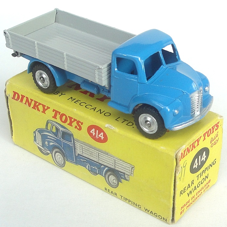 Dinky 414 Rear Tipping Wagon. Blue and grey version with SILVER CAST GROOVED WHEELS. Very near mint/boxed (incomplete). From The Reference Collection. *Exceptionally rare*