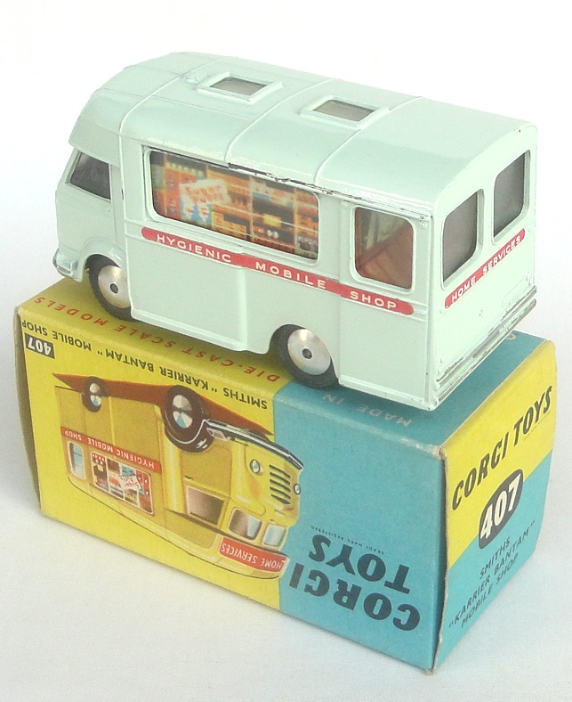 Corgi 407 Smith's "Karrier Bantam" Mobile Shop. Near mint/boxed. 2nd issue - rare to find in the blue and yellow box, grey base. From The Reference Collection.