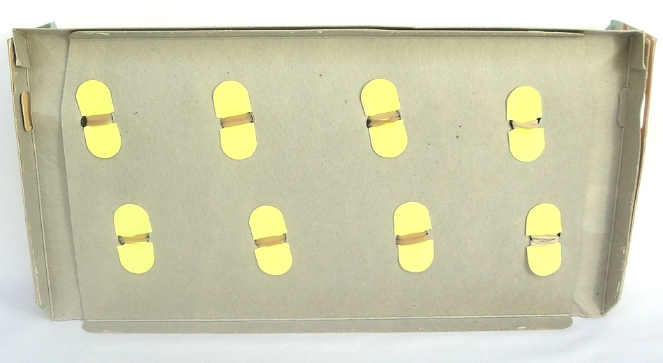 Tear to cellophane on one side and two tears nearby to the card. One small end flap has a seam tear. Remains of the original tape which kept the box lid closed. Additional factory label in white at one short end of the lid with a period price written in pen.
