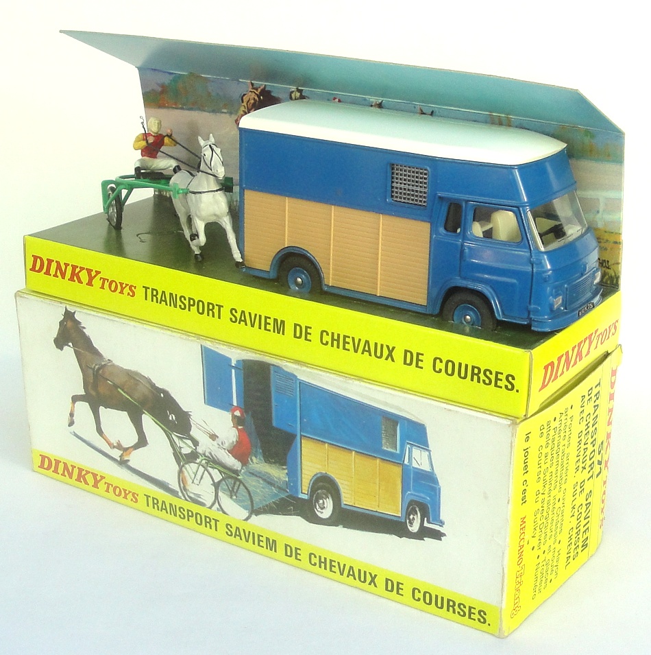 French Dinky 571 Saviem Transporter with Sulky. Very near mint/boxed. With usually missing reins, number plates applied. No Instruction Leaflet. WITH PACKING PIECE. Scarce item from The Heart of England Collection.