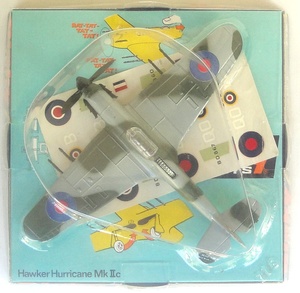 Issued between 1972-75, this aeroplane in camouflage finish looks just about as fresh as the day it left the shop, complete with bright unfaded paper RAF roundels and tail fin labels, three blade propellor and four guns. Intact plastic canopy. Working machine gun noise mechanism. Looks barely handled.