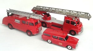3) Dinky 956 Turntable Fire Escape has an original bright red finish, window glazing, silver platform, and ridged Supertoy wheels. Both bright bells are present on the cab roof! Winding handle operates the raising and lowering of the two-piece extending ladder. Several little marks at exposed edges.