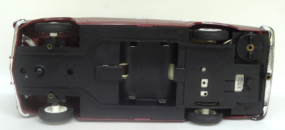 This plastic model from the OK company is rather larger of course, measuring approximately 24cms. Roughly 1:20 scale. A most pleasing example in brownish-maroon, with chrome trim (minor tarnishing). Opening bonnet (reveals the detailed engine) and the opening boot holds the 3 pieces of luggage. Brightest wheels and smooth-running original tyres. Note this example lacks its battery compartment cover- but this does not affect its operation! What fun!