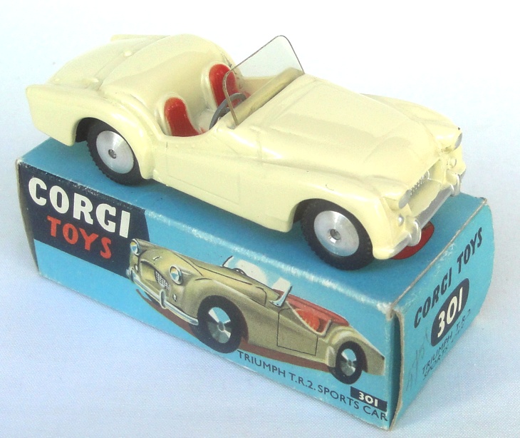 Corgi 301 Triumph TR2 Sports Car. Near mint plus/boxed. Cream version with flat spun wheels. Scarce. From The Worcestershire Collection, largely comprising fine, classic sports and racing cars.
