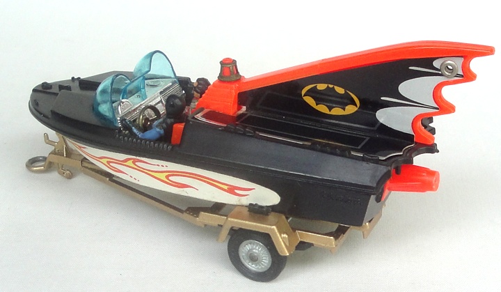 ii) Corgi 107 Batboat. Early issue with the attractive tin fin, sitting on a cast-wheeled gold trailer. A little paint loss at the tow ring. Well-shaped Corgi Toys tyres. Complete paper labels on both sides of the boat (tiny wear), complete with both figures and an unbent tin fin.