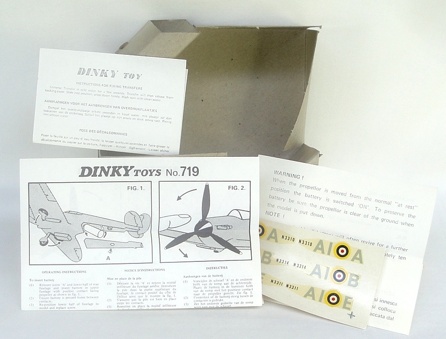 Dinky 719 Spitfire Mk II. Very near mint/boxed. With sheet of unapplied transfers, Transfer Instruction Sheet, multi-lingual 'WARNING' sheet, & Operating Instruction Sheet. With packing. Outstanding! From a large, stunning diverse collection with many items in old shop stock condition.