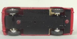 Bright red finish and a deep cream interior on this model which is complete with an intact original windscreen, black steering wheel and suspension on shaped spun hubs, bright baseplate. Fine tread original black tyres run smoothly.