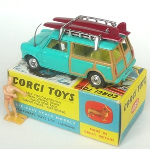 Corgi 485 Austin Mini Countryman 'Surfing'. Very near mint (casting flaw)/boxed. With figure, surf boards & Model Specific Leaflet. From a high quality collection in the U.S.