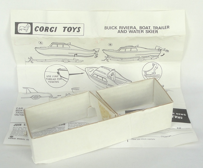This popular Set was made between 1965-68, and comprises Corgi 245 Buick (a hard find in blue-green), red boat trailer, a Dolphin 4 Berth Cabin Cruiser with Captain figure and a water skier. This particular set is in outstanding, unused condition.
