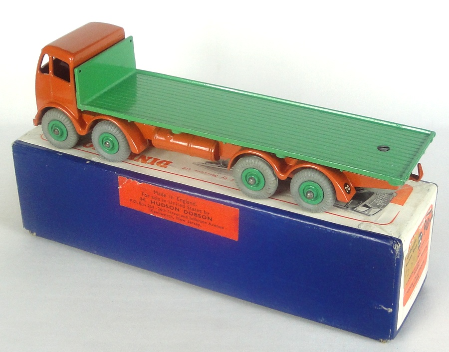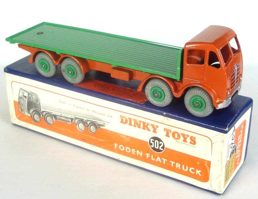 Dinky 502 Foden Flat Truck. Very near mint/boxed. Scarce 2nd type issue in burnt orange and green. With export label. From 1954. From a large, stunning diverse collection with many items in old shop stock condition.