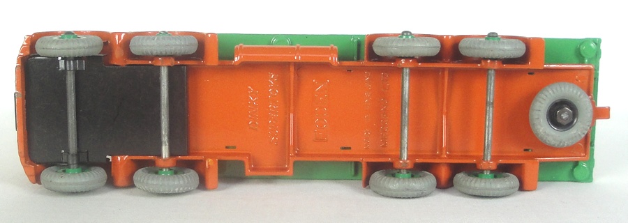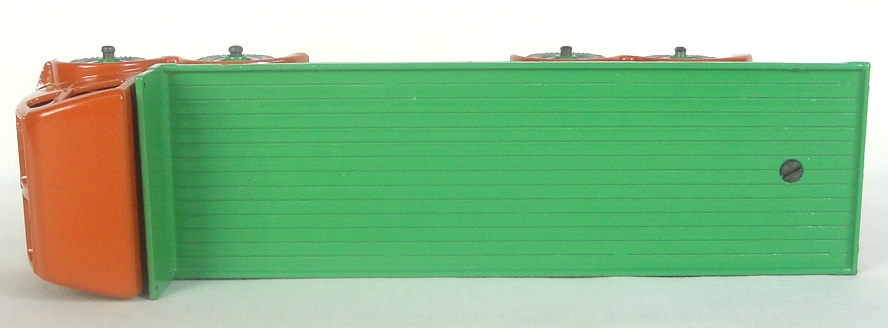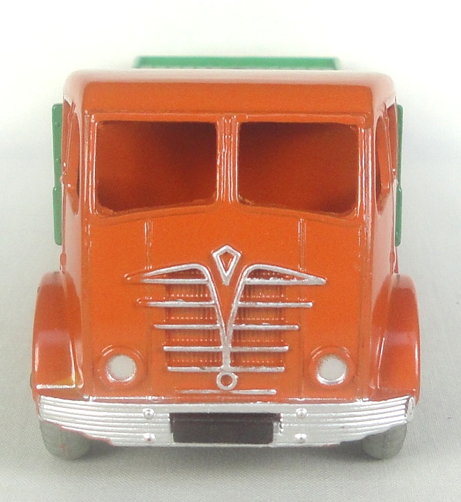 In all original condition, this rare colour version was issued from 1952-54. 2nd type has a distinctive burnt orange finish, mid-green back, matching Supertoy wheels and fine tread original grey radial tyres. Tank slits and chain post bosses. Shiny and fresh original paint finish so this example displays extremely well. Not even the usual chip at the tow hook. Exceptional!