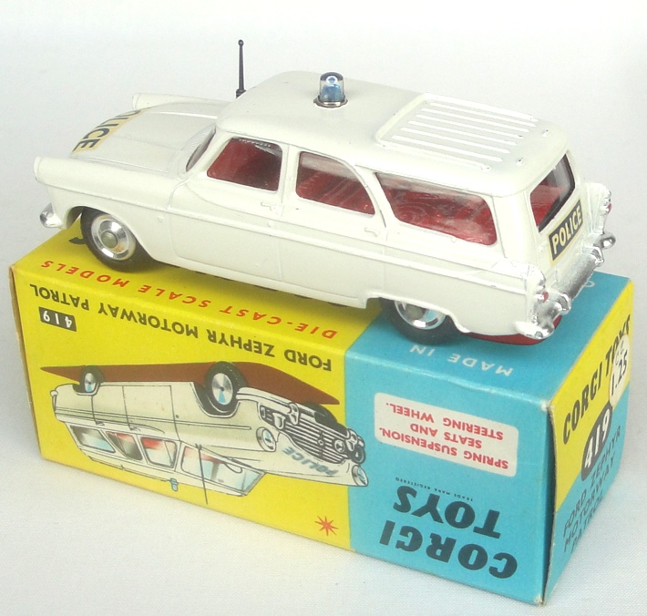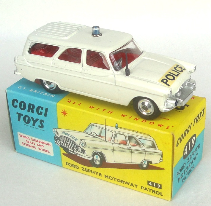 Corgi 419 Ford Zephyr Motorway Patrol. Very near mint/boxed. Shaped spun wheels issue with packing piece. From a large, stunning diverse collection with many items in old shop stock condition.