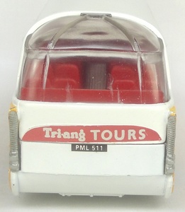 In all original condition, this coach is attractively finished in deep yellow and white with a delicate (paper) red strip and complete ‘Tri-ang Tours’ label at the rear. Complete number plates front and rear.