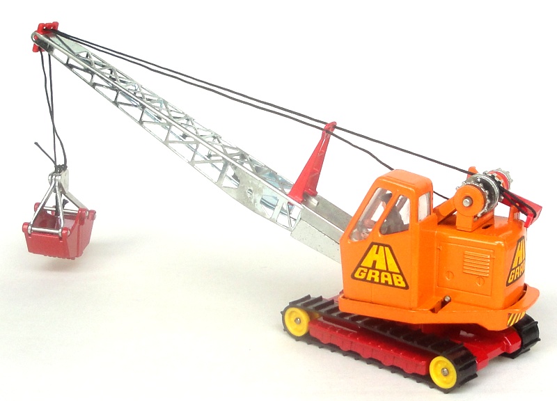 Issued during 1973-74, this Corgi Major model is a delightful example in vibrant glossy orange and red, complete and intact, and functions well. Supple rubber tracks. Bright jib has some tarnishing in places.