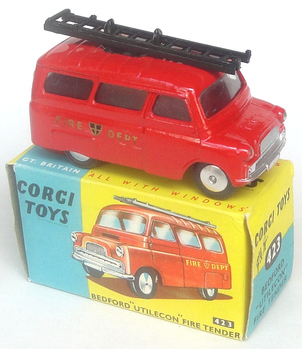 Corgi 423 Bedford "Utilecon" Fire Tender. Red, black ladders, flat spun wheels, one-piece screen, unpainted base. Near mint plus/boxed. Scarce early issue. From a large, stunning diverse collection with many items in old shop stock condition.