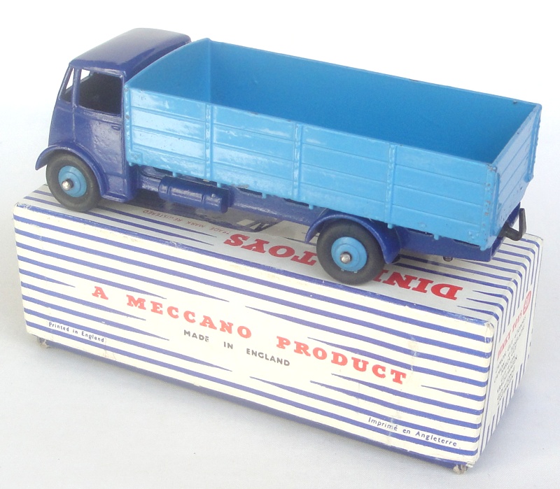 This attractive Guy 4-Ton Lorry has a lustrous two-tone blue finish. A late 1st type example in the transition box, dated 1955 from the Dinky stamp inside the box lid.