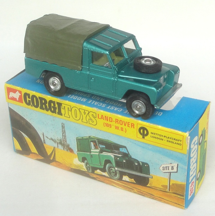 Corgi 438 Land Rover. Near mint plus/boxed. Metallic green version, olive canopy, cast wheels. Scarce find in the blue & yellow window box. From a beautiful, single-owner collection, some 25 years in the making.