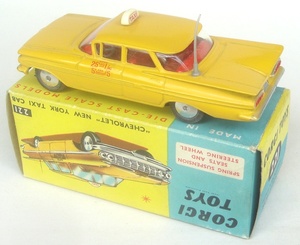 Corgi 221 Chevrolet New York Taxi Cab. Very near mint/boxed. Flat spun wheels issue. With packing card. From a very fine private Cheshire collection.