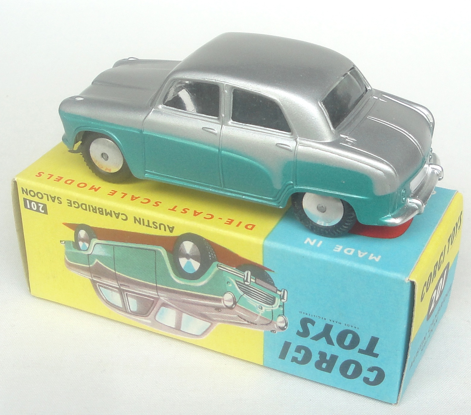 Corgi 201 Austin Cambridge Saloon. Very, very near mint/boxed. Rarest version in SILVER-GREY & METALLIC GREEN. Superlative quality item from The Cheshire Collection.