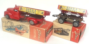 1) Tekno 748 Dodge Truck finished in original brilliant red with matching tinplate back. Very near perfect – perfect delicate transfers on both sides. Tipping function. Swivelling front wheel attachment. Brass baseplate section. Tinplate radiator and front bumper (little rubbing). Minor dulling to wheels. Well-shaped original tyres. Small casting mark on one side.