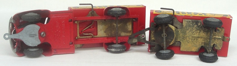 2) Matching tinplate Trailer has very near perfect-perfect delicate transfers on both sides. Side tipping function. Brass baseplate section. Swivelling front wheel attachment. Original box is complete, although there is some wear and tear.