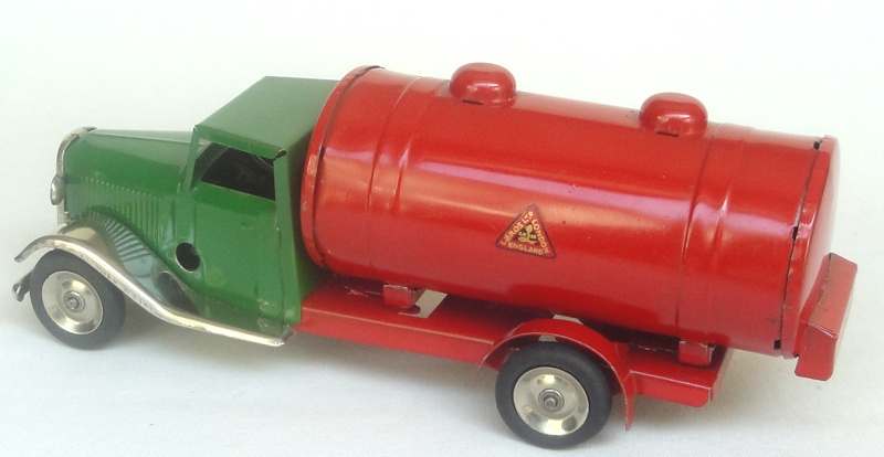 In all original condition, this is a wonderful and scarce display piece from Minic, issued during 1946, with a mid-green long bonnet cab and bright scarlet tank , shiny tinplate wheels, and smooth black, well shaped tyres. Working motor. Version with "LINES BROS’ logo transfers at the sides.