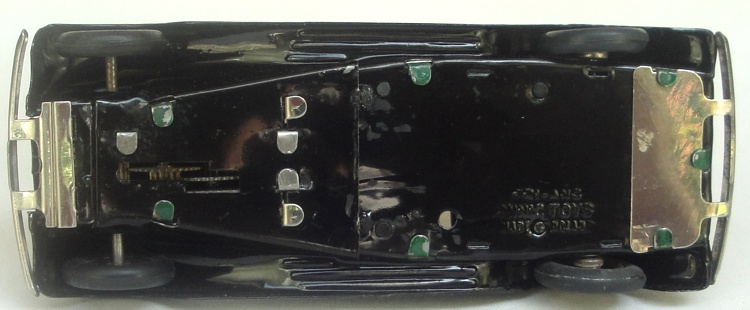 Wonderful and lustrous rich deep green and black finish, cream tinplate seating and shiny wheels. Well-shaped original smooth black tyres (tiny surface split to one – minor). Shiny tinplate radiator, bumper and headlight assembly. Shiny windscreen too! Tinplate steering wheel. Working motor.