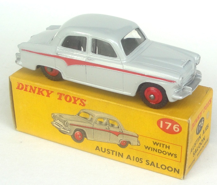 Dinky 176 Austin A105 Saloon. Near mint plus/boxed. Early issue in all-grey issue with red flash. From The Reference Collection.