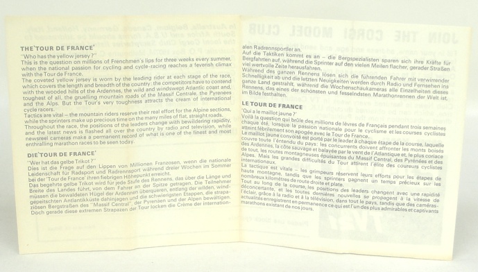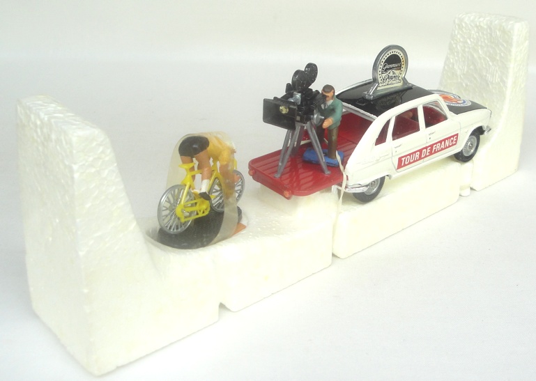 Slightly later version with a plain orange card backdrop inside the box. Crisp, fresh and bright. This set comes complete with the the race leader on his bicycle in his yellow jersey. Original tape in situ!