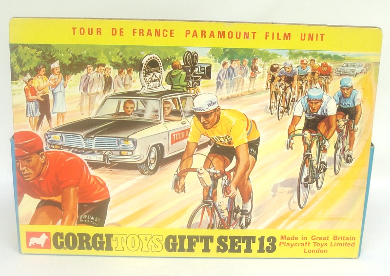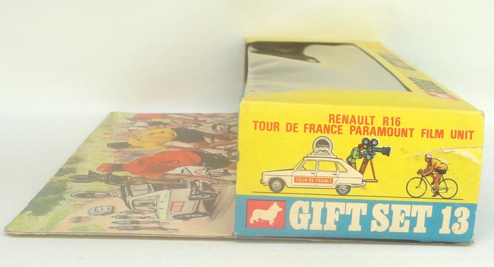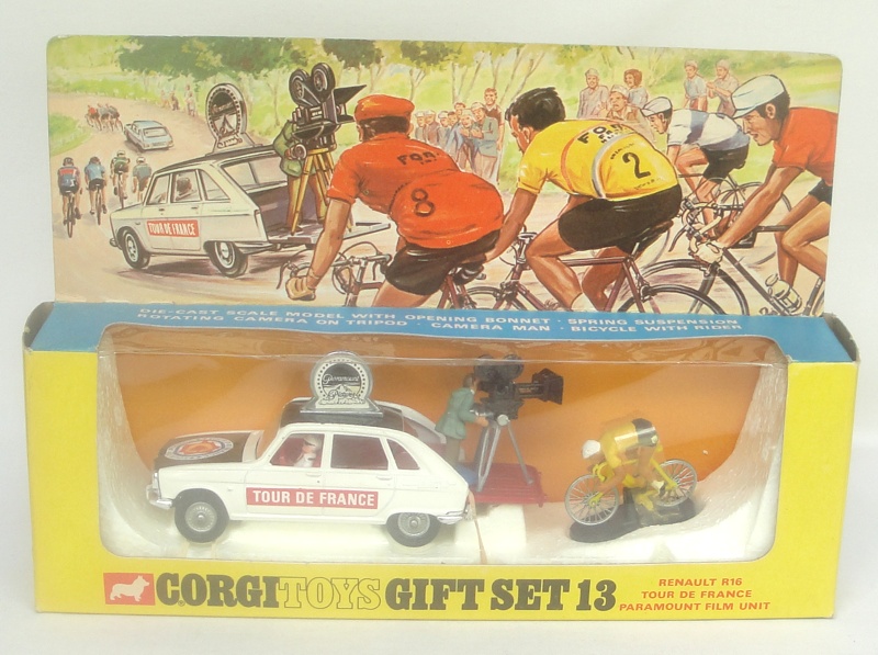 Corgi Gift Set 13 Renault R16 Tour De France Paramount Film Unit. Very near mint/boxed (wear) with leaflet. Later issue with plain orange card back drop and leaflet. From the south-east London Collection.