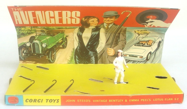 THis example comes complete with the original wrap-around card packing piece and a little unusual added extra – the original Corgi price label for this item, with Corgi Dog logo and ‘The Avenger’s Set ’ print. A rare additional period touch.