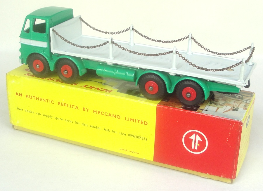 Dinky 935 Leyland Octopus Flat Truck with chains. Scarce green and pale grey version. Very near mint/boxed with card packing piece. Another rare model from an extensive private collection in the U.K.